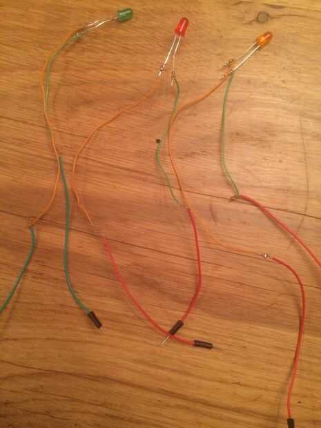 - 3 LEDs (rojo, naranja y verde), 3 cables y 3 resistencias (330 ohmios) para ellos