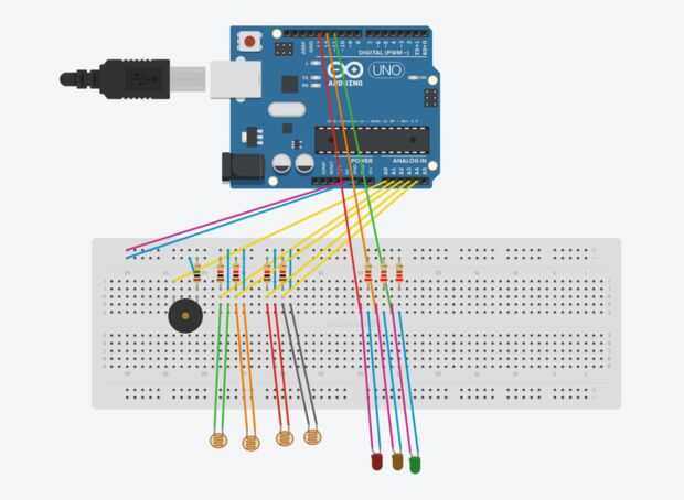 El esquema señalado anteriormente muestra cómo conectar un sensor de presión (reemplazado por un foto resistor en el esquema debido a la falta de una parte FSR en el simulador) a un pin analógico, pero la conexión a una digital es idéntica en el lado de la protoboard.