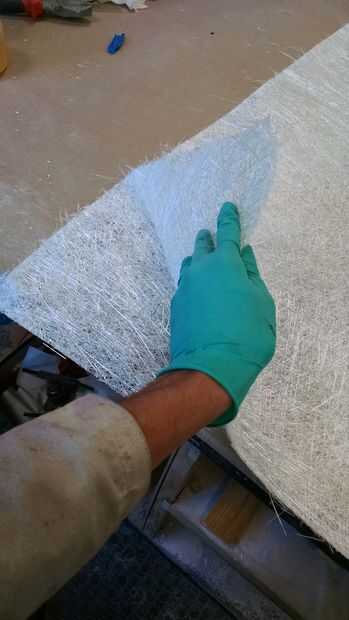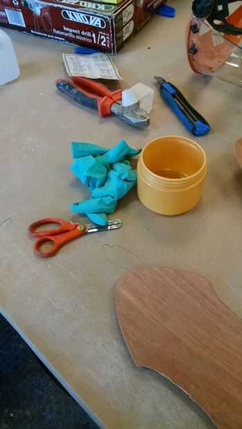 - Aplique una fina capa de resina sobre el triplay con el cepillo, luego una hoja de fibra y resina, luego la chapa como esta:TRIPLAY | RESINA | FIBRA | RESINA | CHAPA | RESINA | FIBRA | RESINA | TRIPLAY