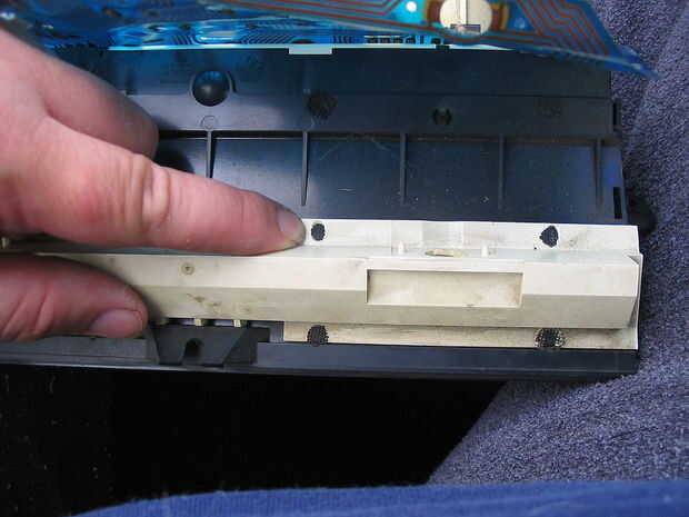 ahora sacar el taladro y perfora-hacia fuera las "soldaduras" por lo que puede quitar la tapa (parte blanca)