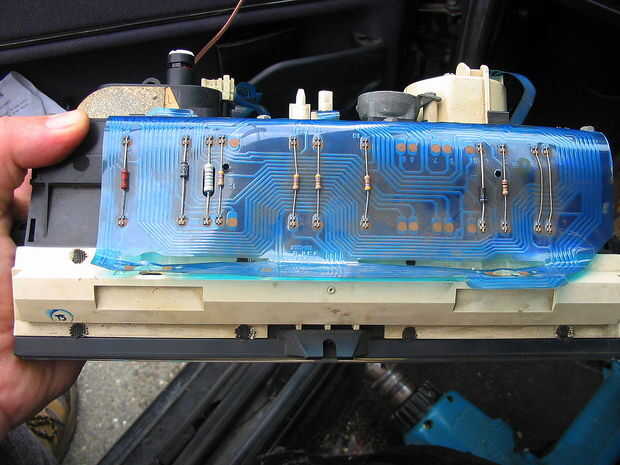 sí abierto arriba y guarde los tornillos. tendrás un bonito agujero donde estaba un grupo de indicadores. es manera más fácil sólo tire out.remove la bombilla vieja y los tornillos que sostienen el tablero de circuito flexible en la parte posterior de la agrupación.