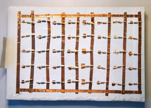 Para el proyecto que terminé usando un 5.1V cargador de pared de un viejo teléfono celular. Equivocadamente aunque necesitaría utilizar resistencias, (LEDs de 3v, 5.1V potencia equivale a resistencias de 120 ohmios) no factor en que el agua tiene suficiente resistencia a sí mismo. Por desgracia, no averiguar esto hasta que fui a través de todo el camino a paso 8 y mi lienzo LED no estaba funcionando como mi prueba uno había hecho. Así que saqué todas las resistencias y ahora funciona bien (aunque es un poco desordenada y tuve que soldar los cables a la cinta de cobre porque no podía tirar de la cinta la parte de atrás).