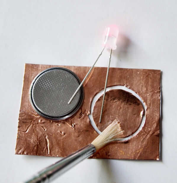 Así que quería probar este primero. He utilizado una celda de botón de 3v, un LED RGB y utiliza agua en la punta de un pincel - funcionó bastante bien.