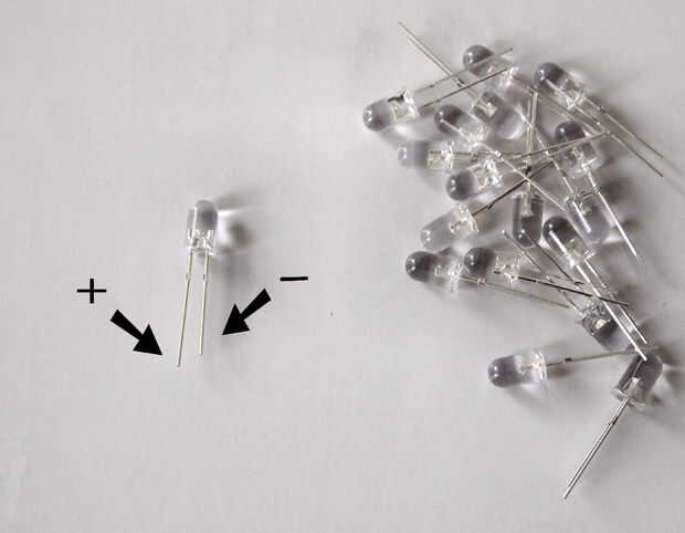 Una palabra rápida sobre LEDs, si no tienes mucha experiencia con ellos, el más largo es positiva (que se conectar al extremo positivo de una batería) y el cable más corto uno es negativo. El voltaje puede variar con el color del LED, cuando usted los compra que se dan generalmente esa información (por ejemplo blanco y azul es de 3V, rojo y verde es de 2V). Si está conectando LEDs en una matriz que deben ser sobre la misma tensión. Usé blanco unos que cuando 3V y RGB color los cambiando que donde sobre 3.1V y que funcionaba bien.
