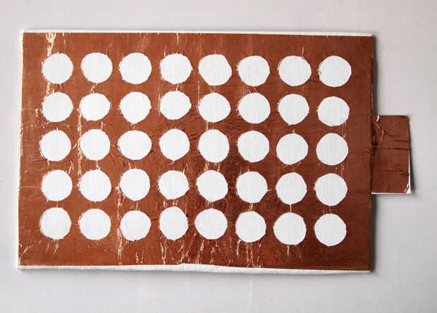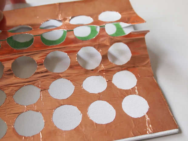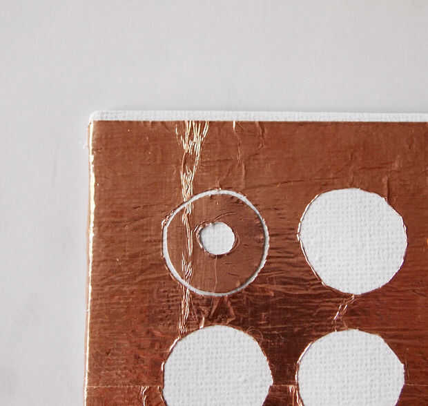 • Una vez que todos los círculos son de corte, cinta de cobre a la lona, no retire el papel de la parte que envuelve a la parte posterior. Tratar de suavizar lo mejor pueda - esta parte puede ser algo complicada.