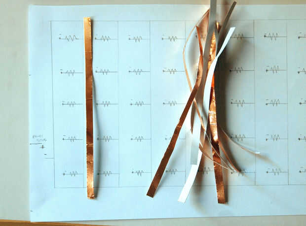 • Cortar la cinta de cobre restante en tiras estrechas, debe tener suficiente cinta para terminar esta tarea