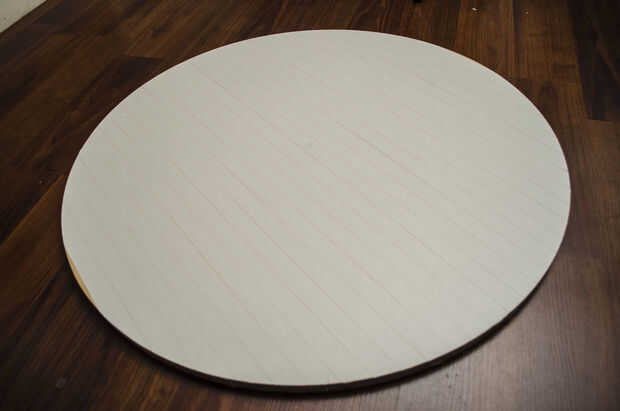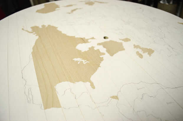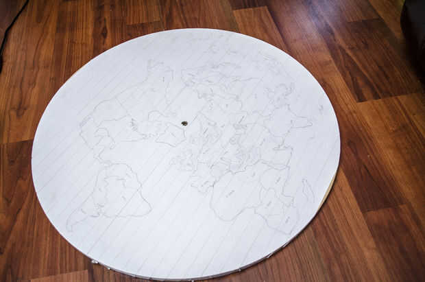 I cover the entire board with artist tape. Intento hacer tan transparente como sea posible para evitar que cualquier gesso o imprimación en el resto de la Junta como plan a cualquier madera expuesta queda la mancha.  La cinta blanca y mate artista me permite esbozar los continentes en lápiz y plan donde voy a colocar cada uno de los países. El reto con este fue imaginar un objeto esférico tridimensional en dos dimensiones superficie circular. Quería mantener la forma de los continentes manteniendo las necesidades del tablero de juego en mente. Algunas deformaciones de Asia era necesario que el Consejo continuar encontrarle sentido. Tenía que haber espacio suficiente dentro de cada país para mantener una buena cantidad de tropas. A pesar de tener que hacer algunas concesiones, estoy bastante contento con la silueta de los continentes y la zona del espacio de juego.