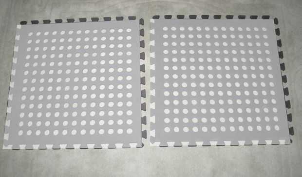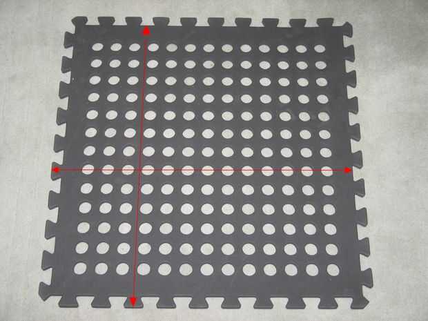 La idea es que las tapas de estireno se van a cubrir el azulejo entero excepto las perillas de dos lados adyacentes. Así los botones expuestos de un azulejo se malla con los cubiertos del otro azulejo y las tapas de plástico va a tocar sin un boquete. (ver imagen)
