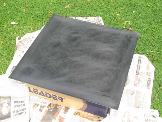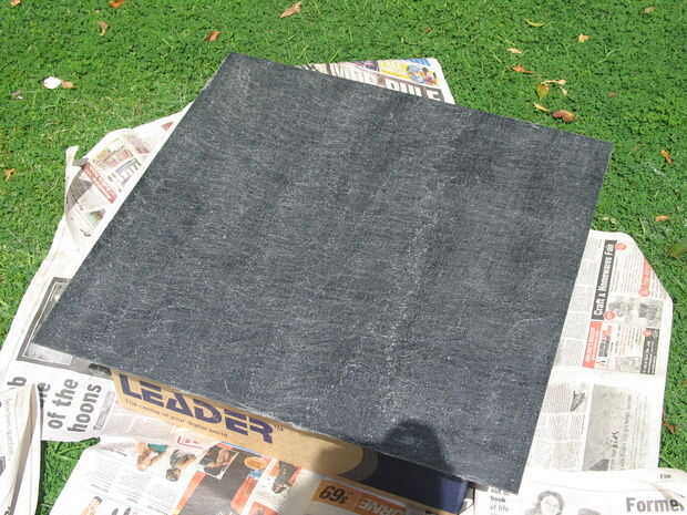 Coloque periódico o una hoja de la gota en el suelo para dejar el pegamento que cubre el suelo al rociar. También utilicé una caja para levantar las tapas de estireno y espuma de azulejos sobre el periódico. Si spray con las tapas y en el periódico el exceso de pegamento empieza a pegarse a ellas y el periódico. Esto hará que sea sucio sacar del periódico, más aún si hay una brisa o viento y el periódico voltea hacia la parte superior o azulejo.