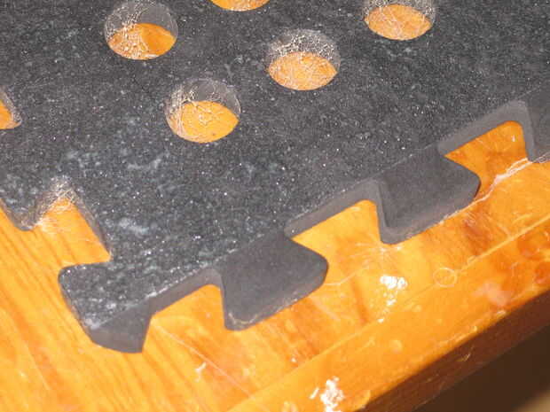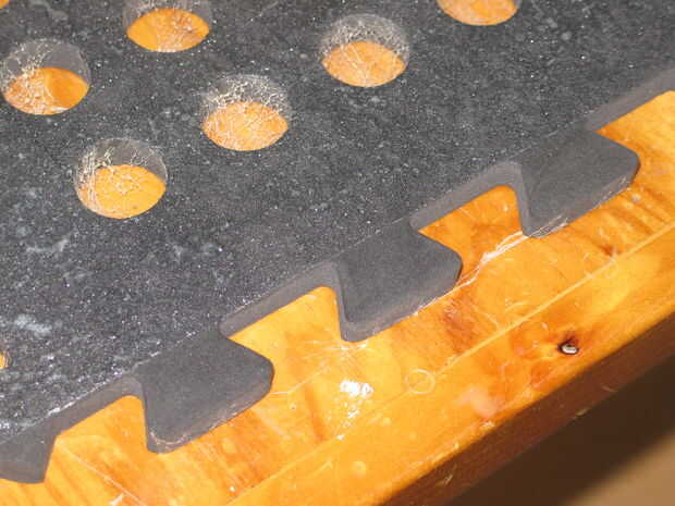 Rociaron un top y una ficha en un tiempo y dejar que el pegamento seco hasta que ya era hortera. Una vez ha rociado el pegamento sobre las losetas de espuma que puede pelar apagado la cinta adhesiva de ambos lados. Debe tener una línea limpia agradable entre el pegamento y la línea de botones en los lados.