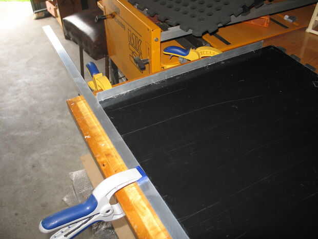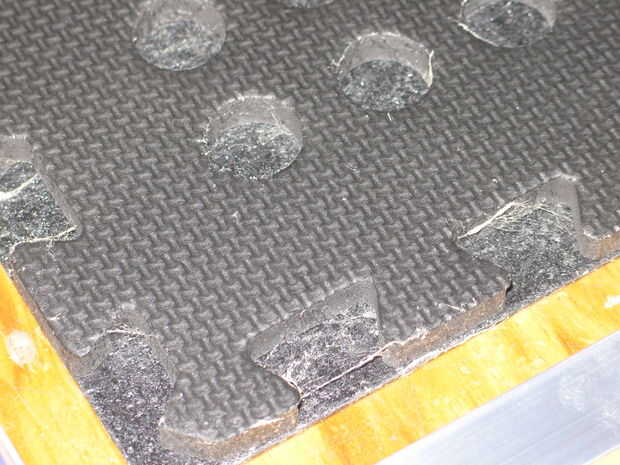 Una vez que el pegamento se ha convertido en algo pegajoso puede colocar la ficha de espuma en el Banco (pegamento hacia arriba) y empuje contra los bordes rectos. Asegúrese de que son los botones con pegamento en los bordes rectos, los sin cola son enfrente de los bordes rectos.
