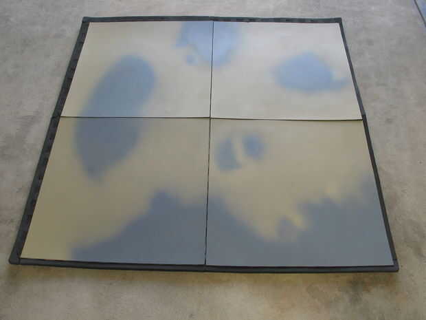 Quite la película protectora de la parte superior. Comience rociando algunos parches de gris con el primer(rock) del auto. Luego rellena el resto con la tan(sand). Usé el primer auto ya que le deja un acabado mate ligeramente áspero, en lugar de la brillante pintura plástica o auto. Creo que la cartilla le dará una mejor superficie si quiere pintar el tablero con la pintura (acrílica) modeladora, aunque no he probado esto.