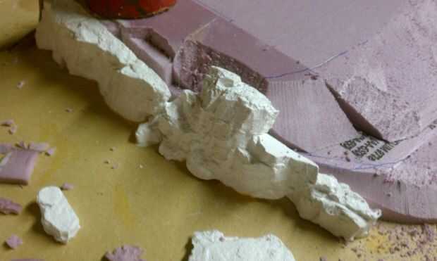 Inicio haciendo un rock completo 3 o 4 moldes. Pegar las secciones grandes a la tierra a lo largo del poliestireno. Para conseguir los trozos de roca que encajan mejor, use una sierra de banda o un archivo para cortarlas. A continuación utilice trozos de roca más pequeños y toscos trozos de poliestireno para llenar el resto del acantilado en. En la colina del borde cortado los bordes de las placas de poliestireno para comenzar a alisar la colina.