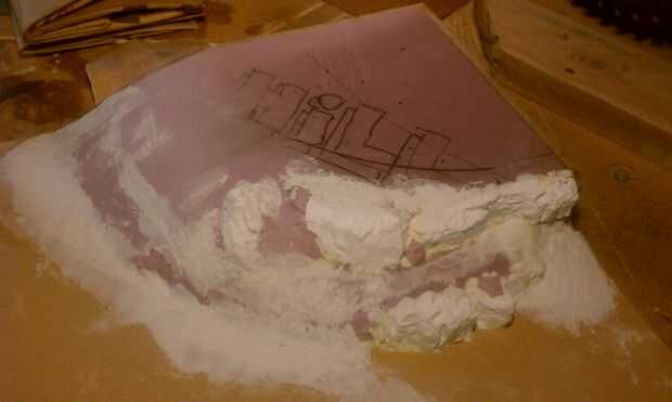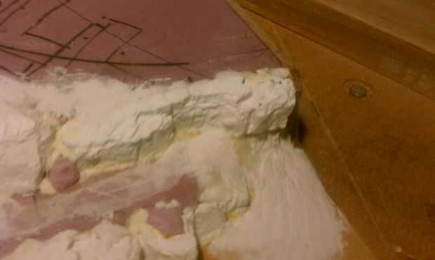 A continuación utilizamos el hydrocal más ligero. la vertimos sobre grietas y otras áreas que quería llenar y luego utiliza pedazos de cartón y las manos para alisar hacia fuera.