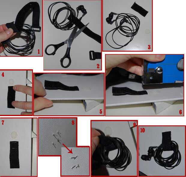 Para el cable sujetador usar sujetadores de gancho y lazo. Utilicé tiras de tela lineal para ronda puntos pegajosos para ganchos y bucles.
