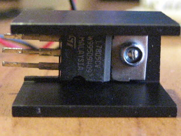 -Regulador de voltaje L7805CV. Te recomiendo poner un disipador de calor, como usted podría quemarse o dañar el regulador Si tienes una salida de alta potencia.