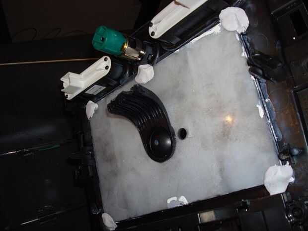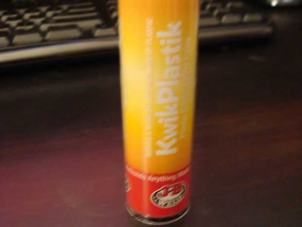 Para mantener el lexan en lugar, la sujeté por la espalda con uno de mis inventos favoritos.  Una masilla epoxi de dos partes.  Este material es ideal para colocar artículos de extraña formados.  Sólo mezclar juntos y pegarlo en.  Cuando se seca va a ser rock duro y sólido.