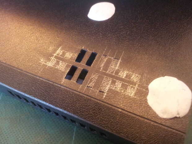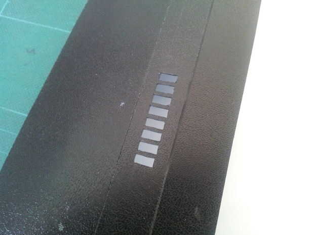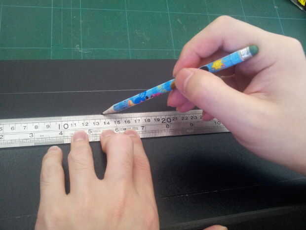 Trace la línea precisamente y córtela en forma de deseo. La única diferencia del papel es que la superficie de lámina de plástico es demasiado suave para la regla de metal para quedarse. Se desliza alrededor de todo el tiempo. Coloque el blu-tack entre regla y lámina de plástico para fijar la posición antes de cortar con cuchilla.