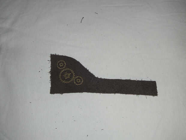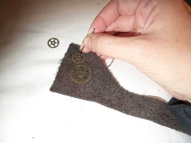 Sew en el engranaje wheeles o lo que quiera en la pieza de la aplicación. Coser en la parte posterior de la piel que las diferentes estructuras en la parte frontal de la caja.