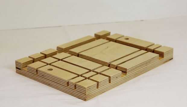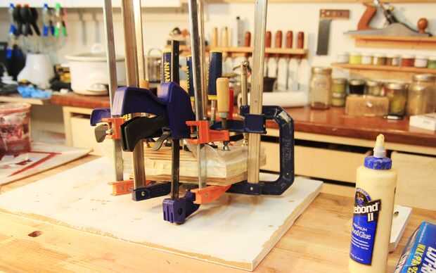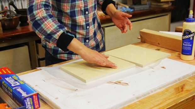 Cortar dos piezas de madera contrachapada, que miden alrededor de 8 x 11 pulgadas. Aplicar una cantidad uniforme de pegamento en ambas piezas y pegar juntos, asegurar con abrazaderas. Déjelo secar.