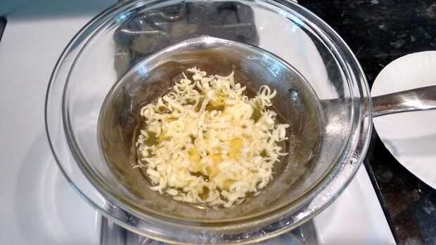 Para derretir la cera más rápido, te recomiendo afeitar hacia abajo el bloque utilizando un rallador de queso. Fundirse la cera usando un baño María (un recipiente de vidrio encima de una olla hirviendo de agua).