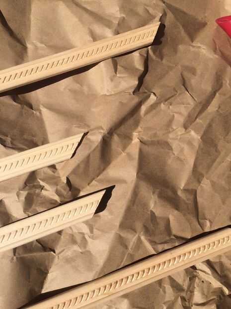 Mientras seca la imprimación y luego la pintura seca, preparado mi trim. Me mide 2 x 3 pies y 2 x 2 pies de ajuste y corte a medida. Luego mide el ancho de la moldura y marcado de los extremos de cada pieza cortada y conectado la esquina lejos apropiada a la marcada apagado punto mediante un corte para hacer un agradable ángulo recto para el guarnecido conectar como un marco para la Junta.