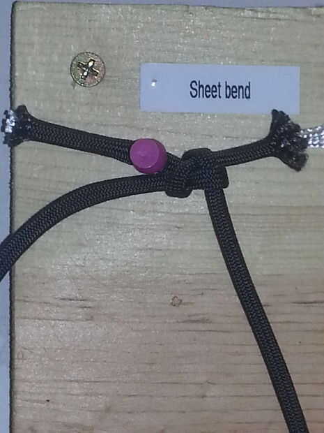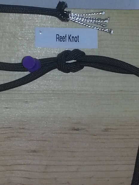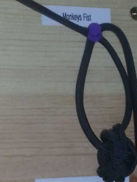una estación atar nudo se puede utilizar para practicar diferentes habilidades nudo-atar. Se utilizaron tablones de madera, tornillos y tubos de PVC en la construcción. Cuerda paracord y nylon son utilizados tanto en esta estación.