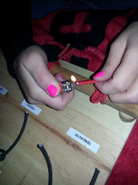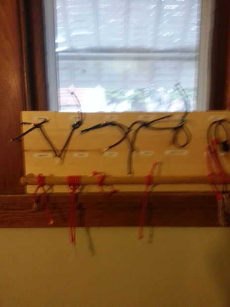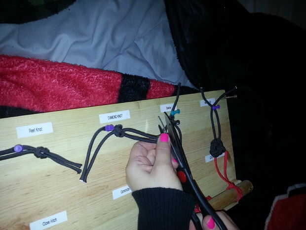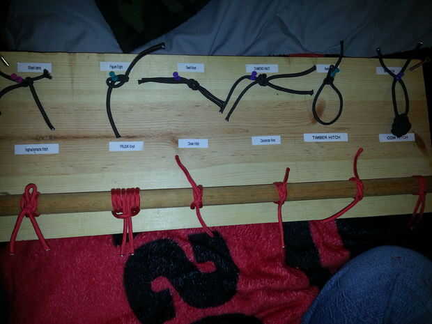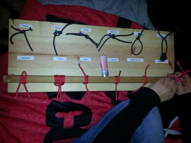 una estación atar nudo se puede utilizar para practicar diferentes habilidades nudo-atar. Se utilizaron tablones de madera, tornillos y tubos de PVC en la construcción. Cuerda paracord y nylon son utilizados tanto en esta estación.
