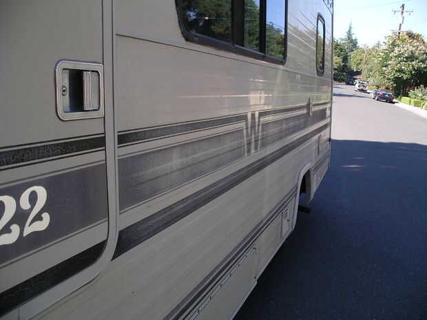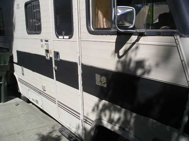 Decidimos que sería pintar las rayas de color marrón oscuras en nuestra autocaravana antigua con pintura de pizarra. Las franjas edad se deterioraron bastante, pero sólo lavar la zona, dejar secar y aplicar 3 manos de pintura de pizarra (disponible en la mayoría de tiendas de mejoras para el hogar y tiendas de artesanía). La seca de la pintura muy rápido y entonces necesita 4 horas para curar antes de utilizar (aunque las direcciones de la pintura pueden variar.)