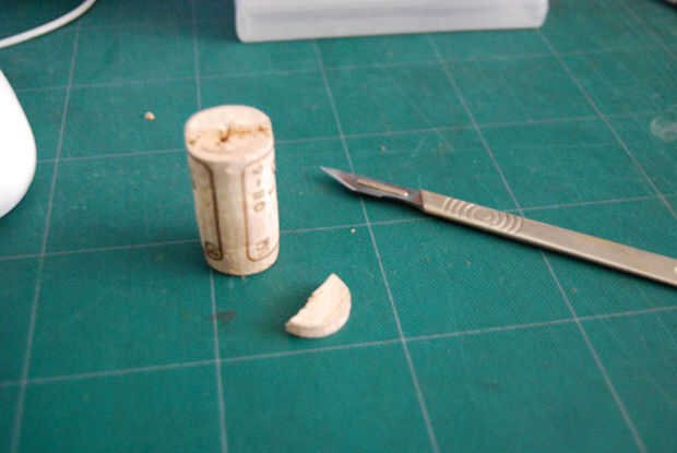 Esencialmente todo lo que necesitas hacer es pegar los corchos a la Junta, pero quería mina a ser un poco más elegante. Escondí el hecho de que había un tablero de corte una astilla semicircular del extremo de todos los corchos de borde. La rebaja entonces se pega al borde de la junta con el labio colgando. Si usted hace esto, asegúrese de que la placa es un corcho completo falta el final ancho (o altura) de la Junta.