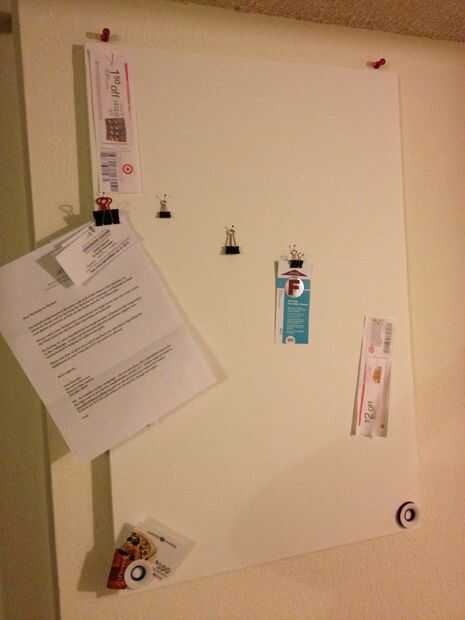 primer! Uno aquí muy simple. Comprar cartón pluma, colgar en la pared. Quería colgar papeles en la puerta de entrada a mi cuarto pero me siento culpable por poner los agujeros en las paredes. Y nunca tienes suficientes pines. Compré el cartón pluma de doble espesor para que las chinches no golpee la pared. Revisa la fotografía para ver el grosor. También, puede usar alfileres de costura para colgar cosas. Me gustaria entrar en un ángulo de 45 grados. Luego puede colgar clips de carpeta y otras cosas sobre ellos. Los soportes de suspensión utiliza recibí de un antiguo trabajo, son lengüetas de plástico, la parte inferior la mitad es adhesiva, la parte superior tiene un orificio perforado en ella. No tienen mucho peso pero creo que son perfectos. Supongo que podría utilizar las tiras adhesivas de comando demasiado, pero que iba a hacer las esquinas inferiores también para asegurarse de que se queda puesto. SE NECESITA! Y NO PASARÁ! ~~~~~~~~~~~~~~~~~~~~~~~~~~~~~~~~~ 1. Tablero de cartón pluma. Tantos como quieras, tan grande como quieras. En una tienda de marco, lo de Michael o Hobby Lobby, usted puede pedir que corte los tamaños de encargo de enormes hojas. Oh, ¡ tienen negro también! 2. chinches o alfileres de coser 3. BINDER clips o clips de papel (opcional) 4. Sostenedor de papel peculiar (opcional)