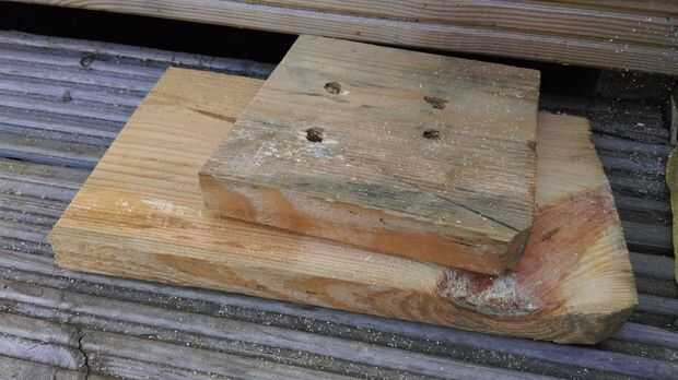 Nota: Si usa un inglete compuesto vio, puede Sujete un trozo de madera como un bloque de tope, mide 13,5 cm del punto de corte de la cuchilla y sólo alimentación y corte hasta que tenga 6 plazas.