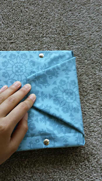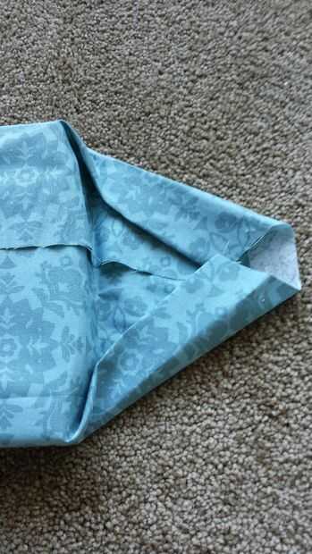 Doblar en las esquinas superior e inferior hacia adentro como se muestra en la segunda foto de arriba. Luego doblar hacia arriba la trapezoide. Doblar hacia adentro el borde cortado de la tela (en la parte superior del trapezoide) antes de fijar en su lugar con chinchetas (ADVERTENCIA: va a ser un poco difícil meter el pasador a través de muchas capas de tela..). Repita en el otro lado.