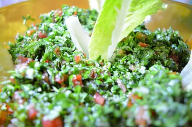 refrescante ensalada mediterránea, servido frío. Más a menudo se sirve en pan plano.Paso 1: ingredientes 1 taza de perejilhojas de menta fresca 1/2 tazaamarillo 1/2 taza cebolla2 tomates2 pepinos sin semillas3 cucharadas aceite de oliva3 cucharada zu