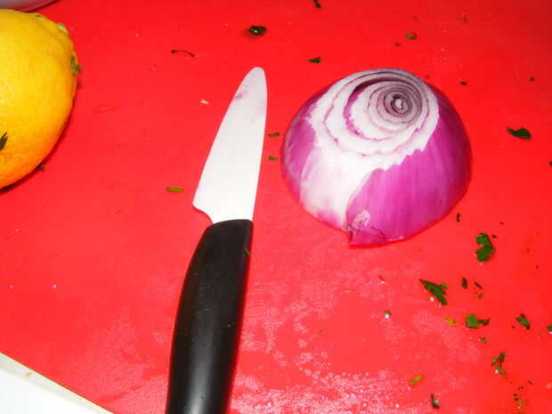 Cortar finamente las cebollas rojas o cortar finamente las cebollas verdes.