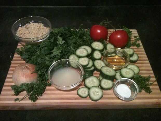 1 taza de perejil hojas de menta fresca 1/2 taza amarillo 1/2 taza cebolla 2 tomates 2 pepinos sin semillas 3 cucharadas aceite de oliva 3 cucharada zumo de limón (o al gusto) 1 cucharadita de sal de mar trigo bulgur de 1/2 taza