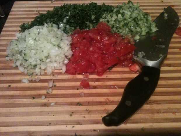 Finamente dados su menta, pepino, cebolla, perejil y tomate.