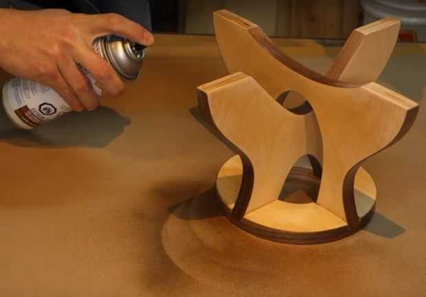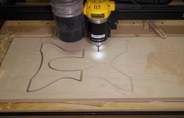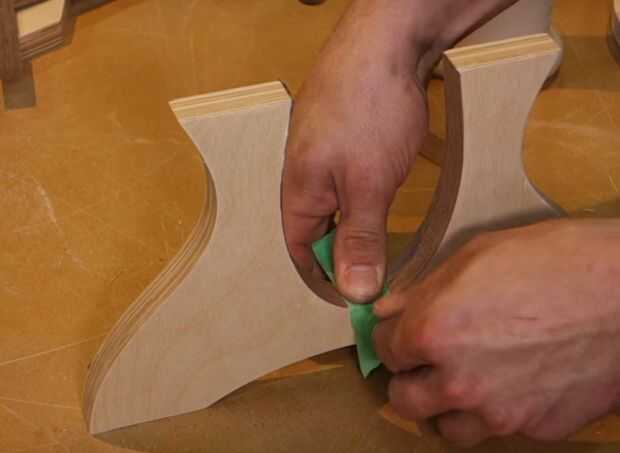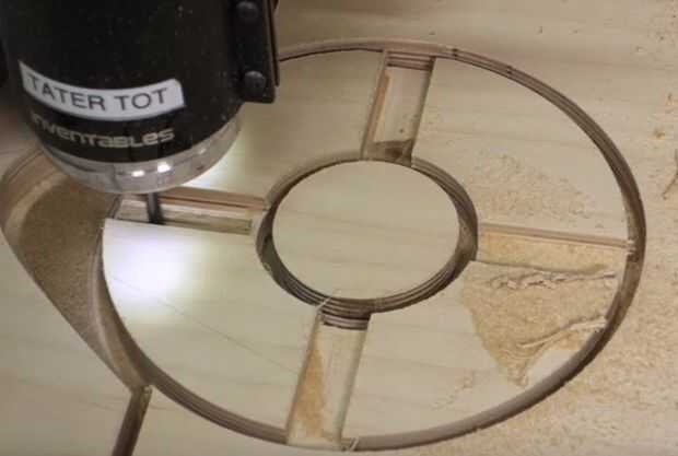 Cargué un pedazo de 3/4" madera contrachapada de abedul Báltico en mi X-talle y utilizar una broca para cortar las patas y soporte de 1/4" espiral downcut. Mi configuración estándar para madera es alrededor de 1000mm/min a 2, 5 mm por pasada. Con el X-tallar, esto no es problema. Le di las piezas un ligero lijado antes de cortarlos sueltas y limpieza hasta los bordes. Para ocultar las capas de la capa, os adjunto la chapa en los bordes con pegamento titebond 3. Una vez que la chapa fue limpiada para arriba, he atado las piernas a la ayuda y le dio unas capas de laca semibrillante Watco.
