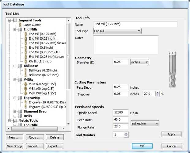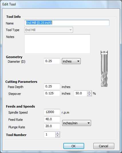 - Haga clic en "Seleccionar" en la final molino ficha seleccionar una fresa de 0.25 pulgadas en la base de datos de herramienta. Te deseamos la profundidad de paso a ser de 0,25 pulgadas y el ancho de paso sea 50% (0,125 pulgadas). Haga clic en "Aceptar". (Imagen 5)