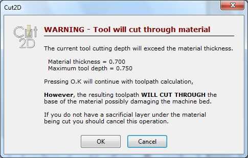 - Haga clic en "Calcular". Aparecerá una advertencia. (Imagen 9) Tenemos una tabla de botín (una "capa de sacrificio") encima de la cama de la máquina que la fresa cortar después corta a través de la madera contrachapada, así que Haz clic en "Aceptar".