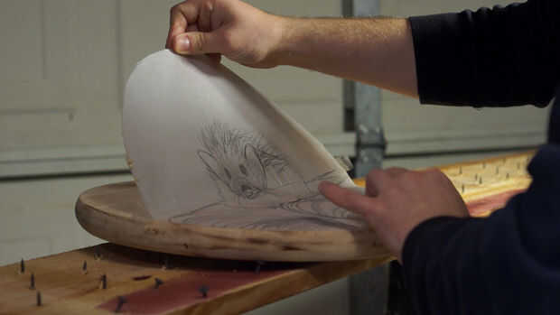 Lije el acabado si uno todavía está en la madera que utilizan. Dibujaba lo que quería tallar y pintar sobre papel vitela transparente. He utilizado Super 77 para adherir la plantilla a la madera.