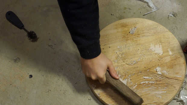 el taburete redondo en este video fue publicado previamente en fotografías. El boxeo tuvo que ser reemplazado y este vídeo muestra una técnica para la fijación de tejido suave y uniformemente alrededor de un redondo taburete, taburete de bar u otoman