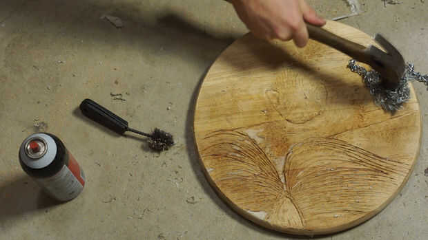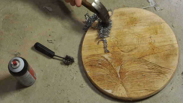 Si pensabas que fuimos hecho con la talla, entonces usted está adentro para un convite. Si tienes estrés, este paso es para usted! Tomar su martillo favorito y vencer a los mocos en el fondo de madera como yo lo hice. Usé las cadenas y el martillo sí mismo para texturizar la madera. Le da profundidad extra que realmente se ve bien con una capa de acabado.