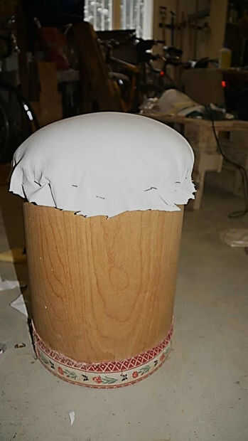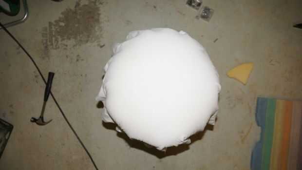 Cuando usted coloque el paño, usted tiene que realmente firme. Si no haces esto, no tendrá luego una buena forma y usted tendrá un montón de grandes pliegues (aspecto bruto..). Cómo hacerlo: si usted tiene un socio, le lay en el casi terminado (unos 20 cm izquierda) almohada para la papelera. Esta wil pone mucha presión en él y hará mucho más fácil para la otra persona sujetar firmemente la tela sobre la madera. Puede parecer tonto, pero funciona! Si no tienes pareja trato de poner algo muy pesado sobre ella, deberían funcionar también.