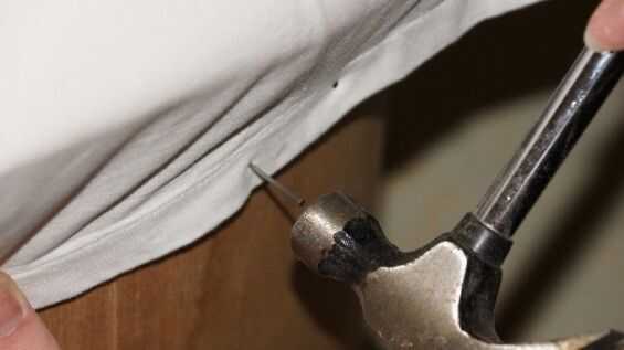 Tienes que cortar un gran suficiente (más bien demasiado grande, usted siempre puede cortar más) trozo de tela. Luego ponerlo sobre la espuma y ahora puede empezar a fijarlo. Para eso necesita las uñas. Martille un clavo a través de la tela en el lateral de la cubeta sobre cada 5 cm. Cuando se los clavo en la madera, no poner la uña entera en ella! Tienes que dejar un pedazo de él fuera de doblarla. Sólo así la tela no rip y realmente sostenerlo cuando se sienta en él (segunda foto)!