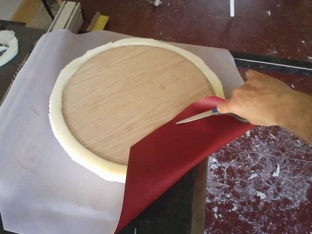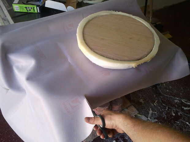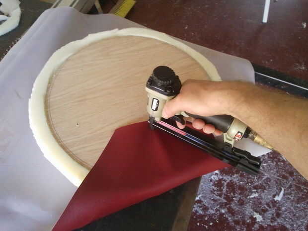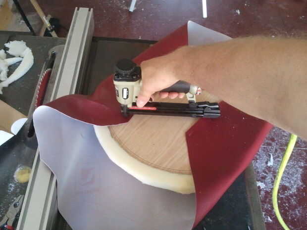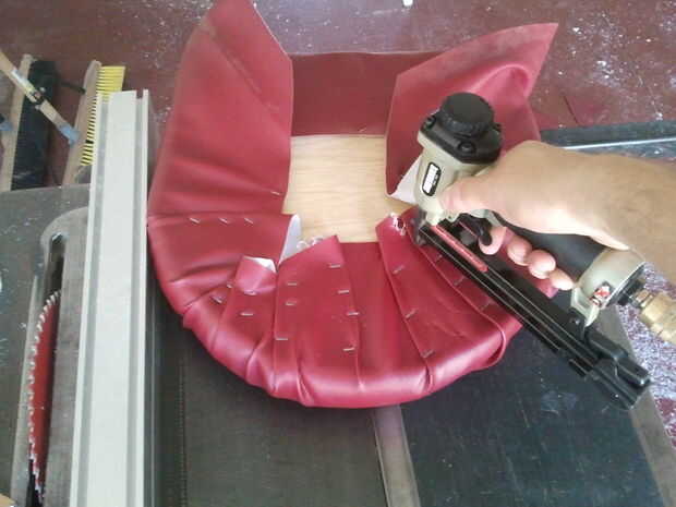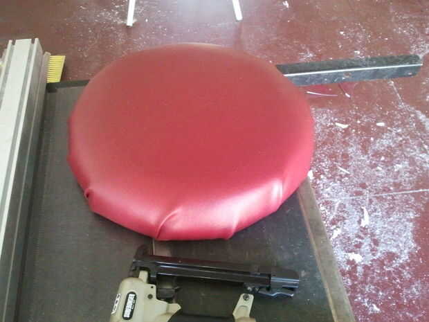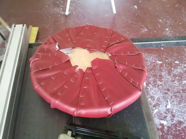 Paso 6: iniciar unos grados lejos de donde usted grapados, agarra algunos material, tirar, doblar y grapa. Repetir todo el camino alrededor de las heces. Trate de mantener tantos pliegues ocultados a la vista como sea posible. (No pude hacerlo muy bien) o al menos mantener los pliegues uniformes.