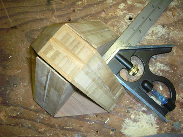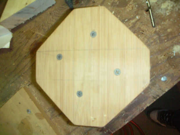La base de las heces se hace de algunos trozos de 3/4 contrachapado de bambú. Cortar las formas en una sierra de cinta, luego había laminado dos de cada uno con pegamento de uretano, que es bueno para superficies no porosas. Contrachapado de bambú es muy duro y muy denso, lo que hace difícil trabajar y pegar, pero excepcionalmente fuerte. Que carecen de acceso a la madera contrachapada de bambú, hacer las piezas de madera contrachapada regular o una madera densa como el roble. Las piezas tienen un ángulo de 37 grados a los lados y son aproximadamente 4" de arriba a abajo. El ancho en la parte superior es de 1-1/2", igual a la anchura de cada pieza y cada pierna. La placa inferior es 1/4" madera contrachapada de bambú.