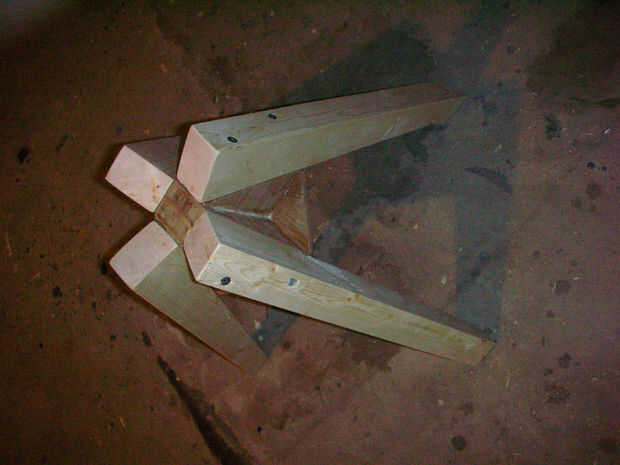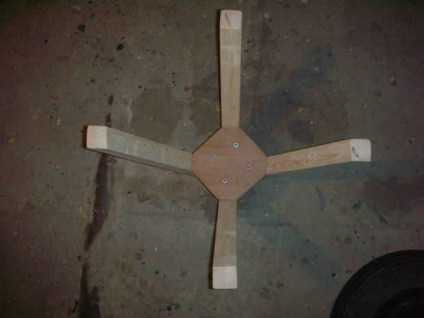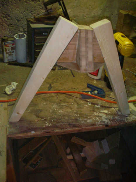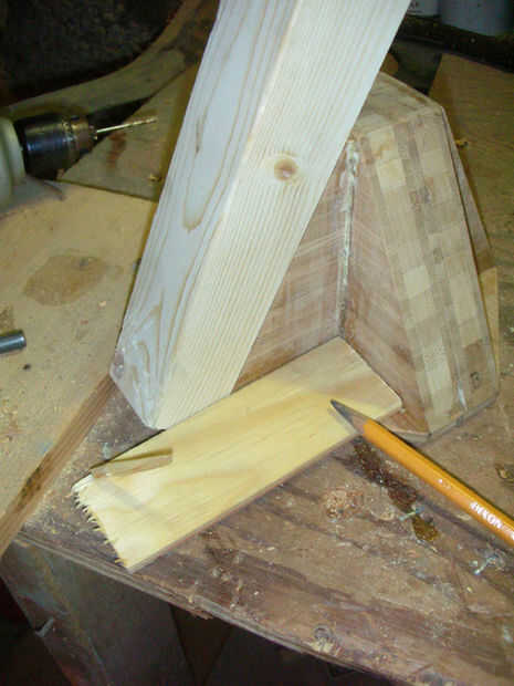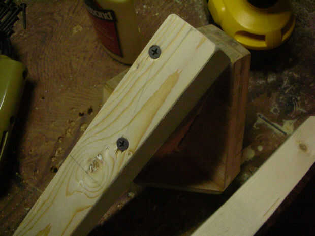Perforar agujeros piloto y cola y las patas en lugar de tornillo. Ser cuidadoso compensar los tornillos tan 1) no empiezan una escisión en el pino, y 2) así que los tornillos están centrados en el ancho de cada pieza de madera contrachapada. Si usted en el centro de la anchura total de la madera, los tornillos podrían ir en el empalme del pegamento entre las piezas y forzarlos aparte. Usé 3" tornillos de drywall rosca gruesa. También podrían utilizarse tornillos galvanizados.