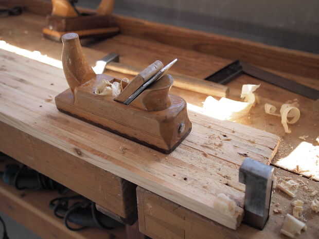 11) mientras espera, el asiento puede ser continuado. Empezar por cepillado de la placa, que se pega en el paso 5. Una vez que esté satisfecho con el acabado, la plantilla fuera del círculo y cortar con una sierra de calar. Use un cepillo de mano en combinación con papel de lija.