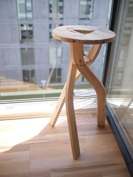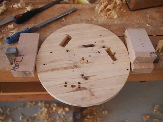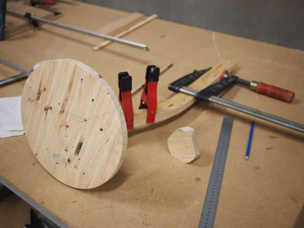 3) el asiento se hace por las tiras de sujeción juntas para hacer una junta, que se cortan en un círculo. Configurar una plantilla simple para empotrar las tiras y pegado. Usted necesitará abrazadera sin apretar dos piezas de madera plana a través de las tiras de madera para mantenerlos en plano con otros. Asegúrese de utilizar plástico entre las herramientas y la sujeción de madera.